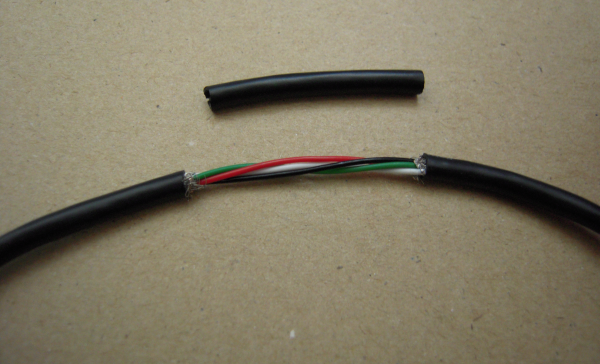 そいでその辺をテープで絶縁しつつ、一番最初に剥ぎ取ったアウターの黒いケーブルをかぶせて、完成。