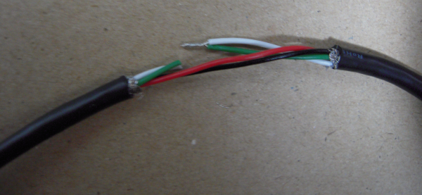 たぶん、緑がD+で白がD-なので、えいやっと切る。でもやっぱり不安なので、テスターで確認してみると、確かにその通りだった。